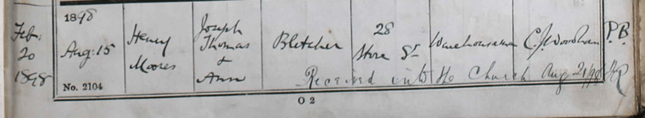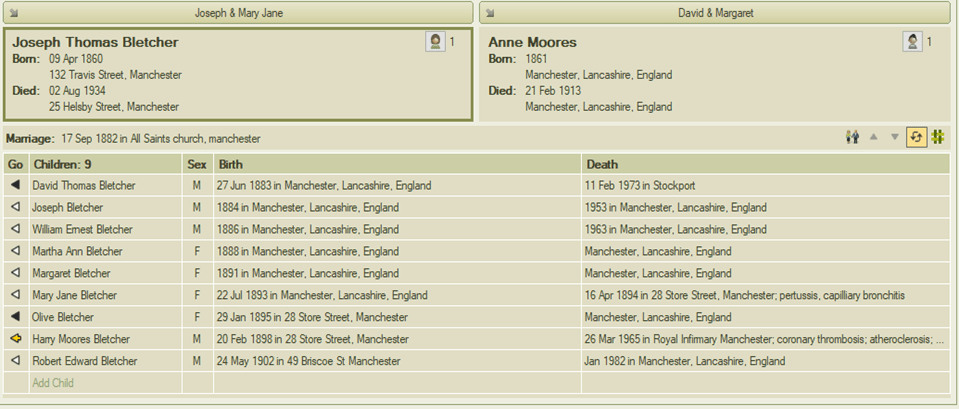 Harry Moores Bletcher was born on Sunday, 20 February 1898, the eighth child (and fourth son) of Joseph Thomas and Annie Moores. The couple had a total of nine children—five sons and four daughters.