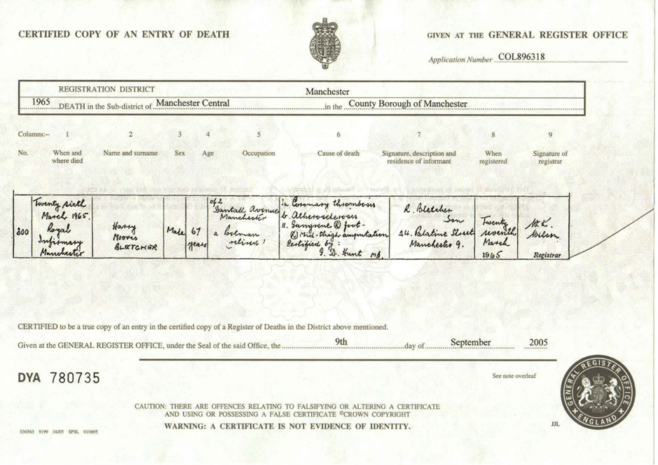 The 1921 census shows Harry and Sarah living at 26 Gatley Street, Ancoats with their son Harry who was born in the early part of 1920. The house was compact, with 3 rooms in total for the small family and they lived here for some years.