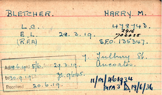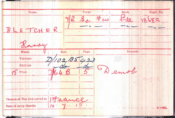 The dates on the pension card (and the fact Harry stated he was a soldier on his wedding certificate in January 1919) would seem to suggest that Harry was demobbed at the end of March 1919.