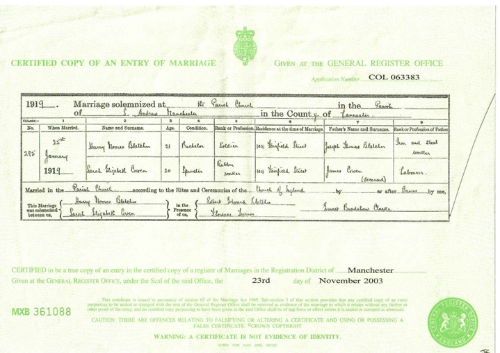 January 1919 was bitterly cold, with heavy snowfall in Northern England. On Saturday, 25 January 1919, Harry Moores Bletcher married Sarah Elizabeth Cowen at St. Andrew’s Parish Church, Travis Street, Ancoats.
