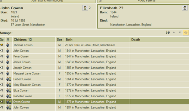 | 1881 | 67 Loom Street | John is 50 and Eliza is 36 Robert (14), Mary Ellen (12), Eliza (9), Bella (3), Owen (2) Given that John was born around 1821 his age should be 60 |