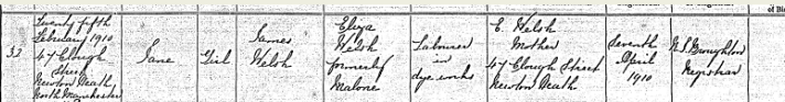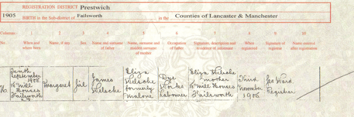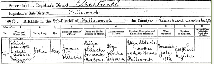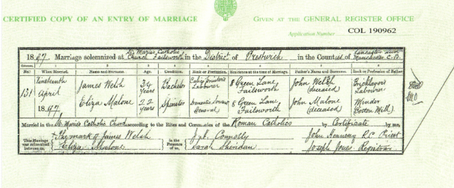 James and Eliza Malone were married on Monday 19 April, 1897 in St. Maries Catholic Church, Failsworth. James signed the marriage record with ‘his mark’, suggesting he was likely illiterate. His father was listed John Welsh (deceased).