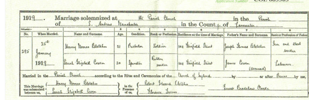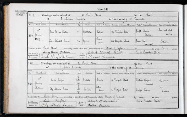 In January 1919, just two months after the end of World War I, Sarah Elizabeth Cowen married Harry Moores Bletcher at St. Andrew’s Church, Ancoats—the same church where her parents had wed 20 years earlier.