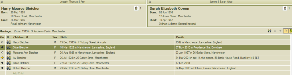 Olive, their daughter, was born on March 10, 1922. At that time, they were living at 309 Great Ancoats Street with Sarah’s mother and stepfather.