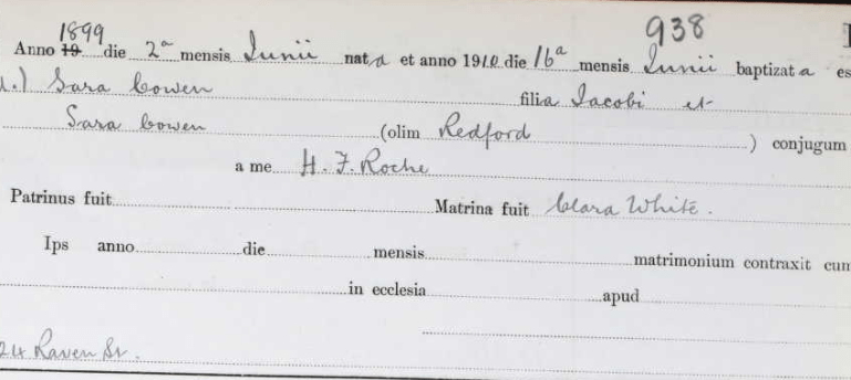Sarah was baptized for a second time on 16 June 1910, at the age of 11, into the Catholic Church. This was unusual, particularly as she had already been baptized as an infant in the Church of England. Several factors could explain this delayed Catholic baptism — it may reflect a family conversion to Catholicism, a retrospective decision to formalize her religious affiliation, or other personal or religious circumstances unique to the family at the time.