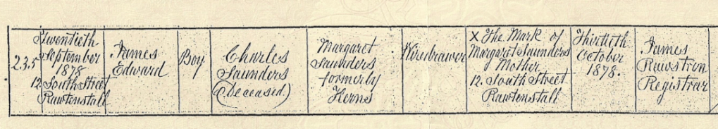 James’s birth certificate, issued in 1878, records his father as Charles Saunders (deceased), however no corresponding death certificate could be found. The next available record — the 1881 census — shows Margaret and her youngest son, James, living in Burnley, with no trace of the older children. Margaret described herself as a widow and gave her birthplace as Leeds. Such inconsistencies in census data were not uncommon at the time and do make tracing family histories particularly challenging.