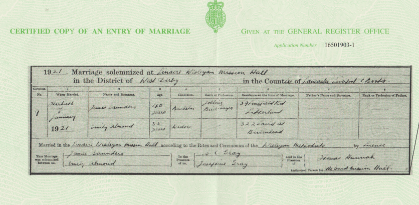 In the 1921 census, James is head of the household in Birkenhead, living with Emily Almond and her two children from her first marriage. James is described as a builder’s labourer but was out of work.